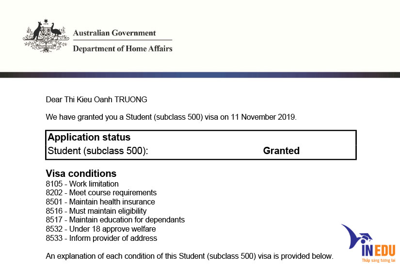 Tin mừng Visa du học Úc chỉ sau 2 ngày submit của Trương Thị Kiều Oanh