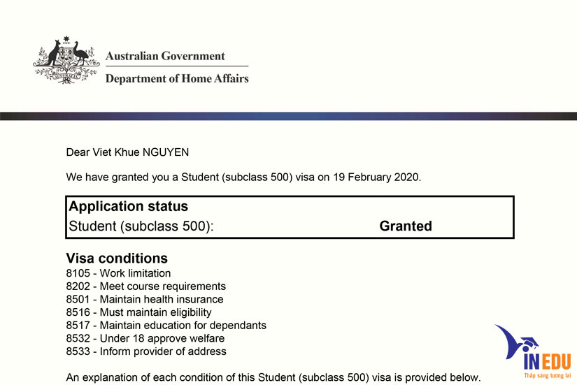 Chúc mừng Visa du học Úc của Nguyễn Việt Khuê.